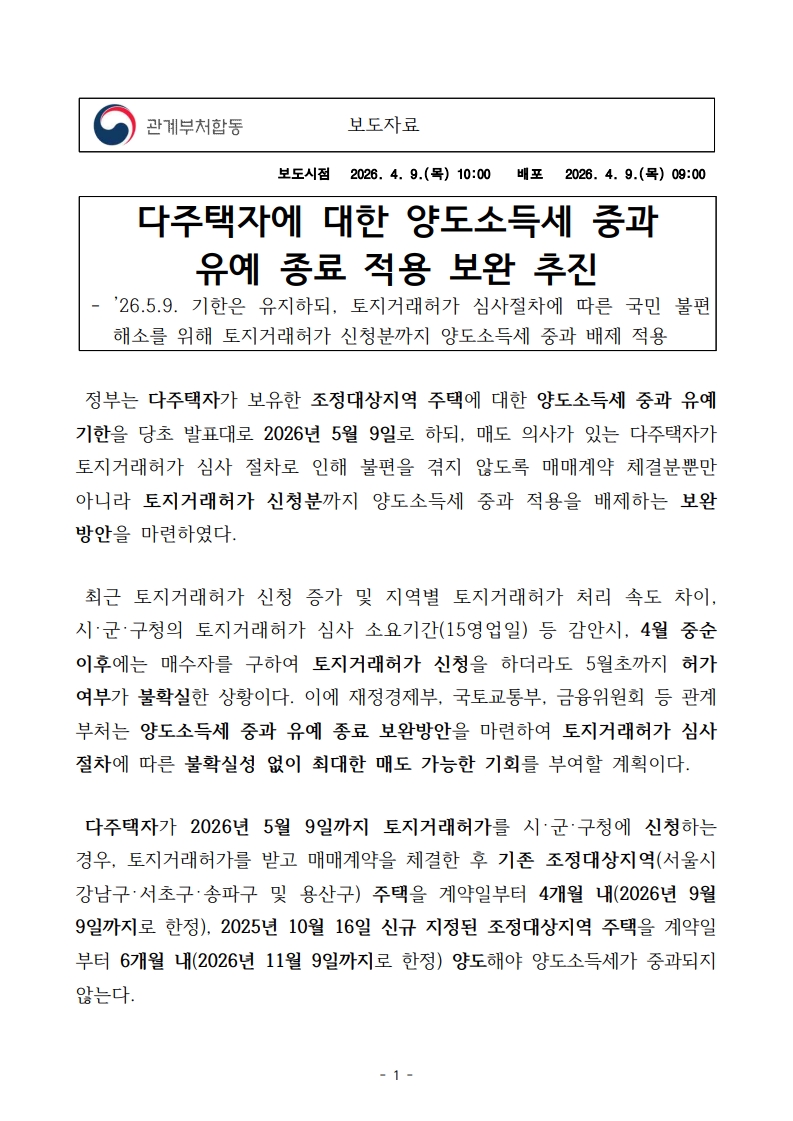 다주택자 양도소득세 중과 유예 종료 시점은 원래대로 5월 9일로 유지됩니다.
