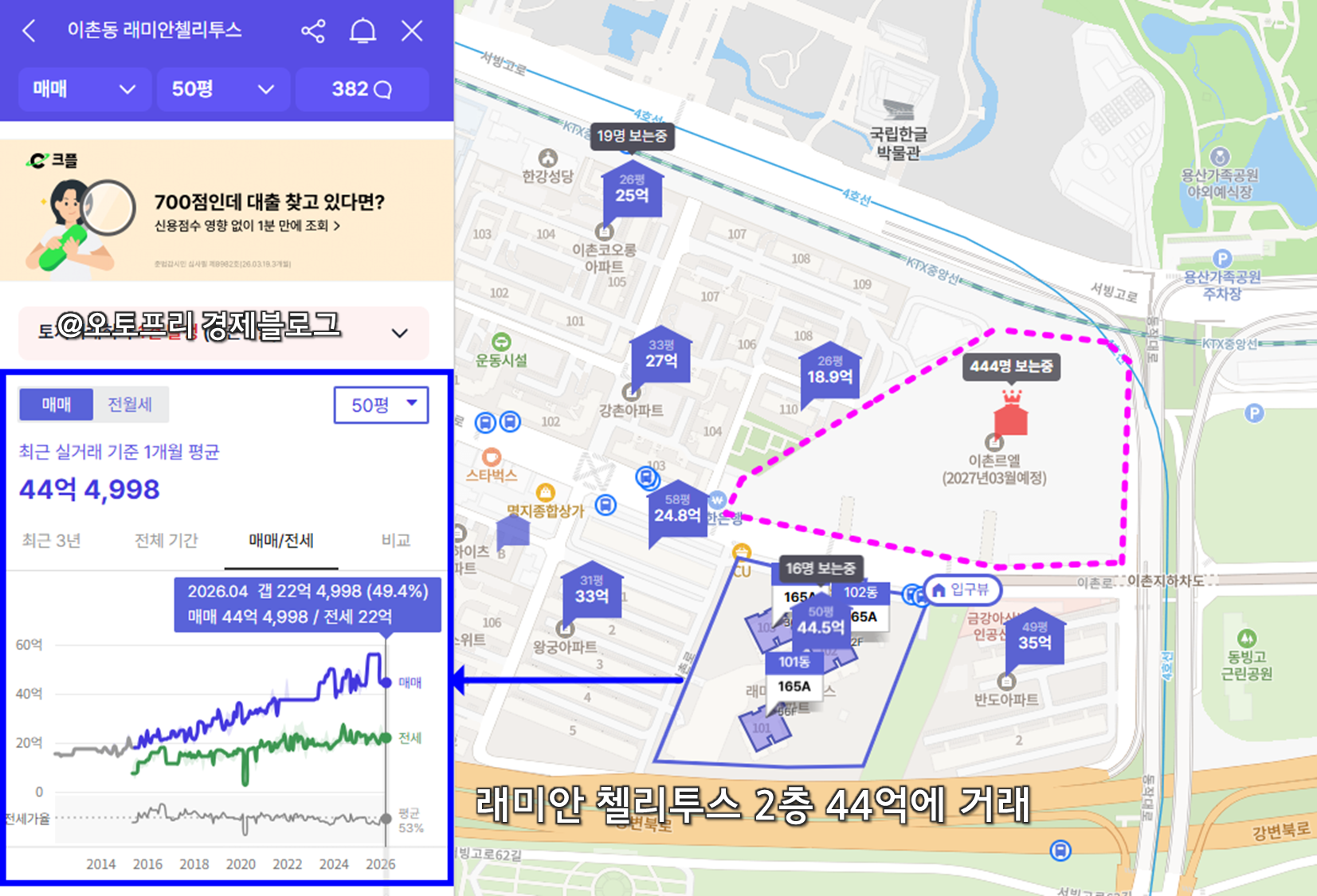 - 최고의 교통 인프라: 4호선과 경의중앙선 더블 역세권인 '이촌역'까지 걸어서 10분 컷입니다. 여의도, 광화문, 강남 등 핵심 일자리를 20분 내외로 끊을 수 있는 사기적인 위치입니다.
