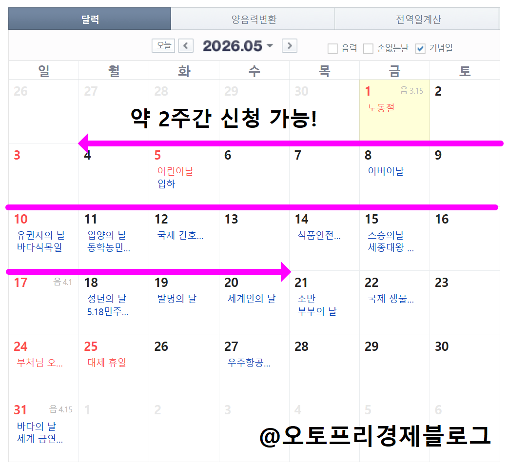 청년내일저축계좌 해당 사업은 상시 모집이 아닌 특정 기간에만 신청을 받으므로, 일정을 사전에 파악하고 준비하는 것이 중요합니다. 5월초부터 단 2주동안만 신청이 가능합니다.