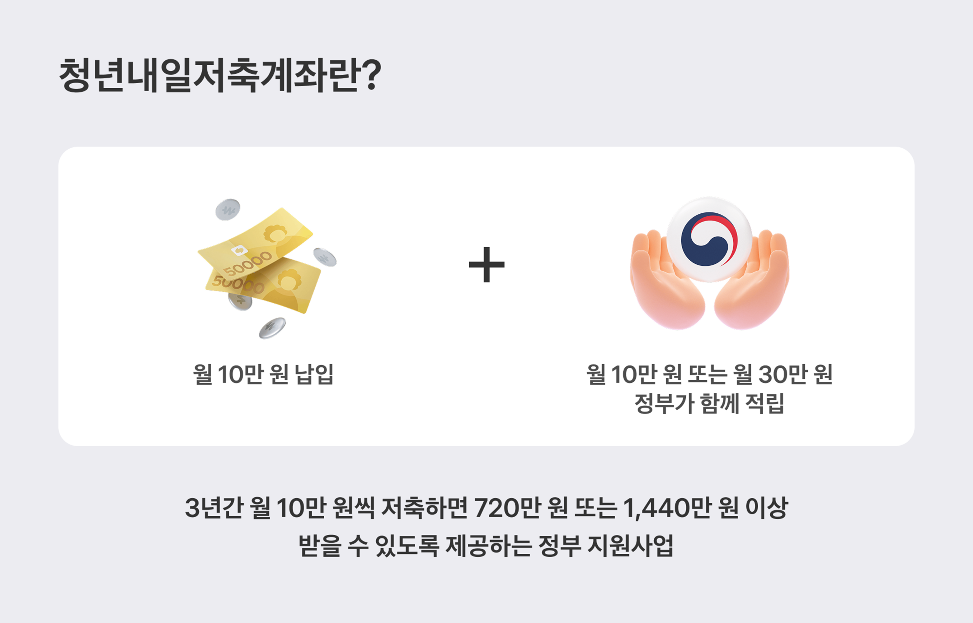 월 10만원 | 월 30만원 | 1,440만원 + 최대 연 5%대 이자 |