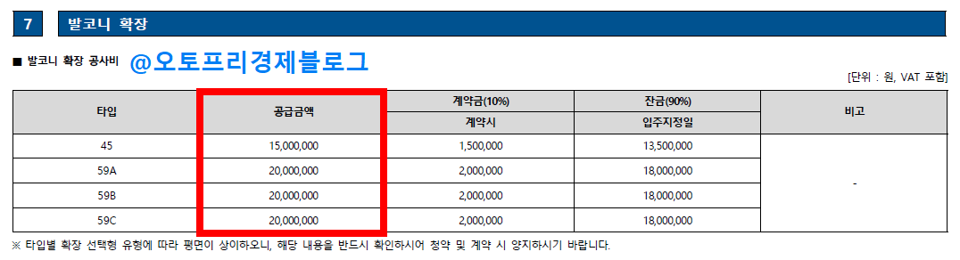 여기서 발코니 확장비는 별도입니다. 45타입은 1,500만 원, 59타입들은 2,000만 원이 추가로 붙습니다.