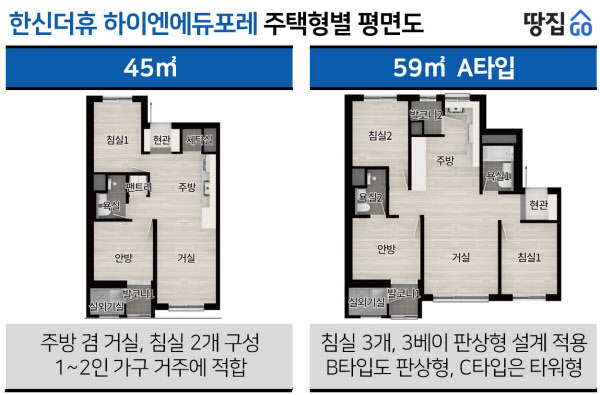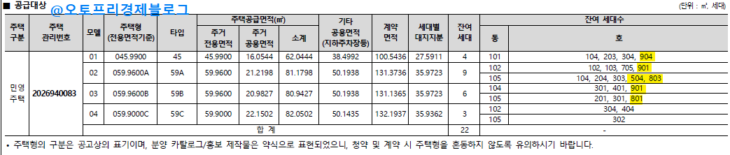 - 이번 공급 물량 : 이전 공급 후 남은 잔여 22세대 (45㎡ 4세대, 59A 9세대, 59B 6세대, 59C 3세대)